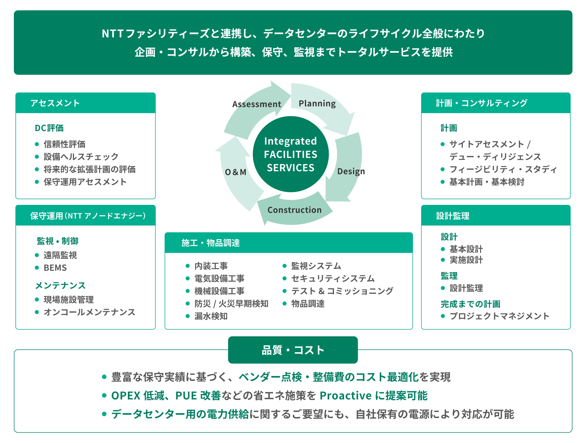 具体的には、NTTの通信サービスや様々なデータセンター事業者向けの設計・構築で培ったデータセンター向けの高信頼電源システムの構築をNTTファシリティーズと共に提供します。