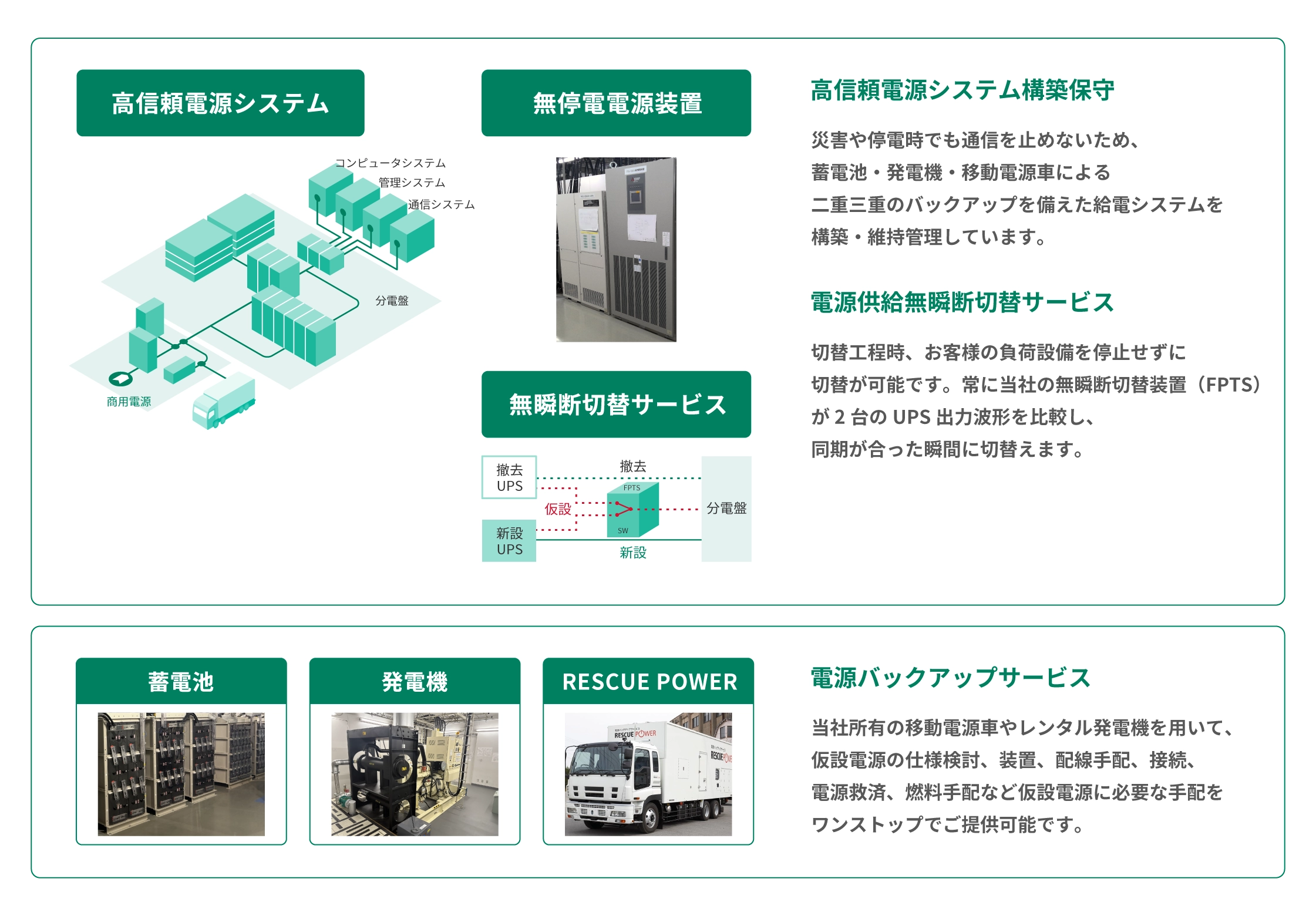 無瞬断電源切替技術 ミッションクリティカルなサービスに使用される電源システム(UPS)の更改時において、サービスに影響を与えることなく、新旧電源装置の切替を行うサービスを提供します。