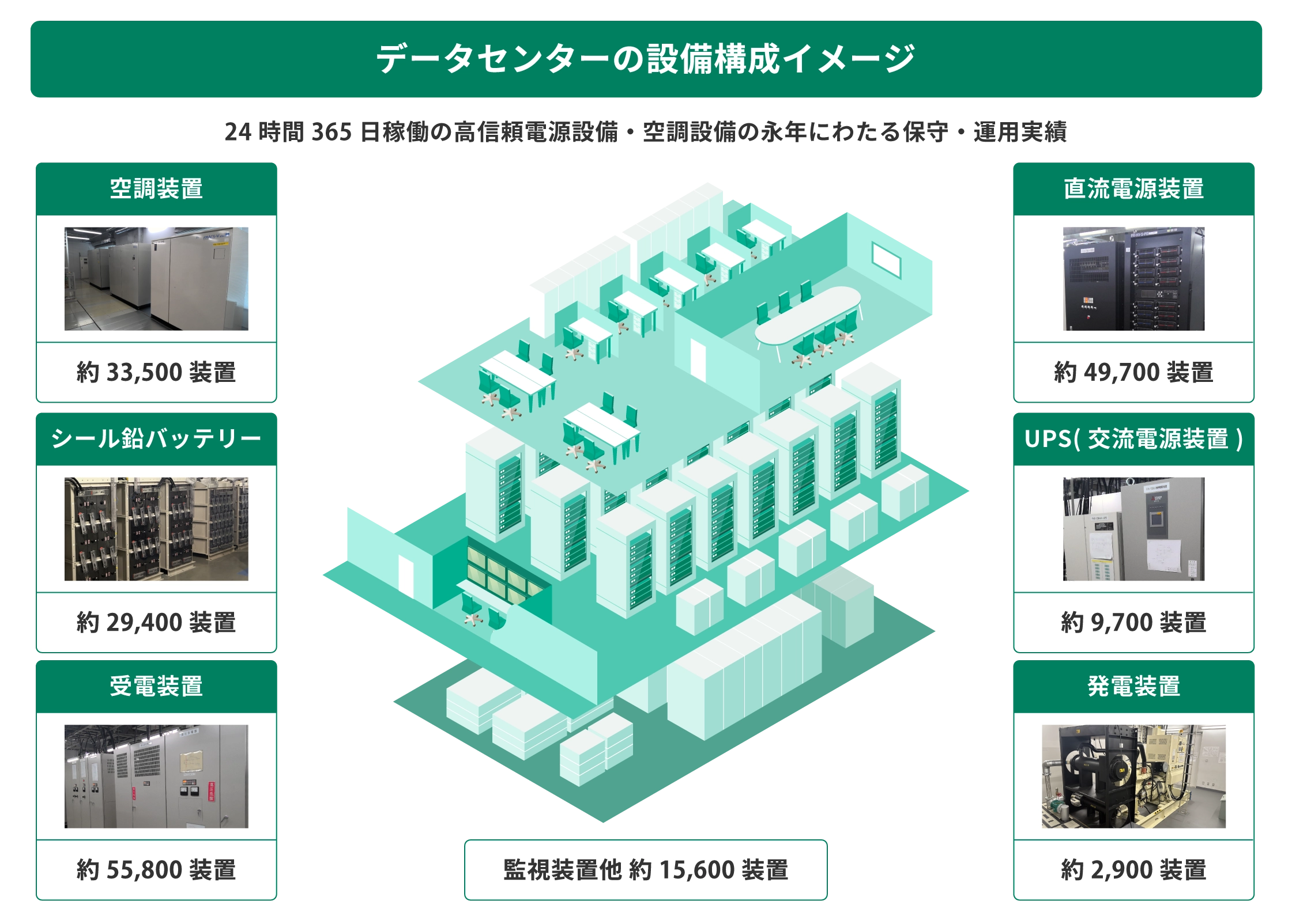 電源システムの構築・保守の実績 重要なライフラインであるNTTの電気通信サービスを支える電力システムを、100年以上にわたり守ってきた実績を生かしたサービスを提供します。